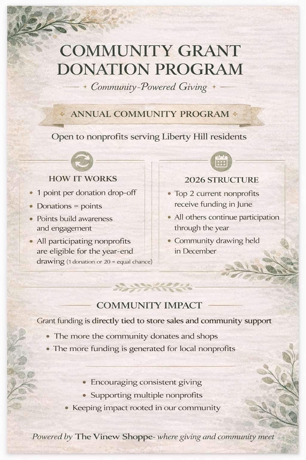 Donations may be dropped off during regular store hours. Grant points are tracked by drop-off, not by item quantity, and are updated online every Monday. If no nonprofit is selected at the time of drop-off, the donation will not be counted toward the Community Grant Donation Competition.